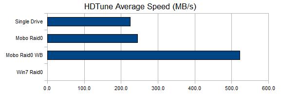 The main conclusion to be drawn from this is that the RAID method doesn’t seem to matter that much when the storage devices are this good. The Intel SSDs provide nearly linear scaling when inserted into a RAID0 configuration, which is quite remarkable. With magnetic hard drives it is hard to get much speed bonus with a RAID. It does appear that write-back caching has some magical bonuses, especially in the older HDTune benchmark. Indeed, the system does feel a tad snappier with write-back caching enabled. But be aware that write-back caching is a data integrity risk. If you experience a power or system failure write-back caching can cause file loss or damage of any files written.